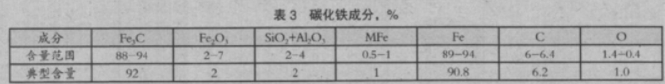 由表3 可見,碳化鐵中含碳量高達6%,可滿足現(xiàn)代電弧爐煉鋼高配碳的要求,并且具有以下優(yōu)點: